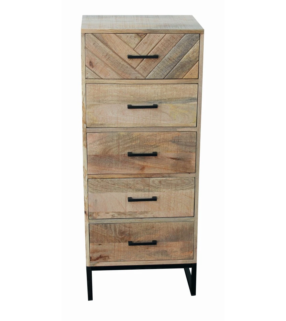 Ce chiffonnier bois Tapan associe avec harmonie le bois mango et le piètement en acier noir. Avec ses 5 tiroirs, il offre un bel espace de rangement. Un meuble simple, pratique et esthétique.