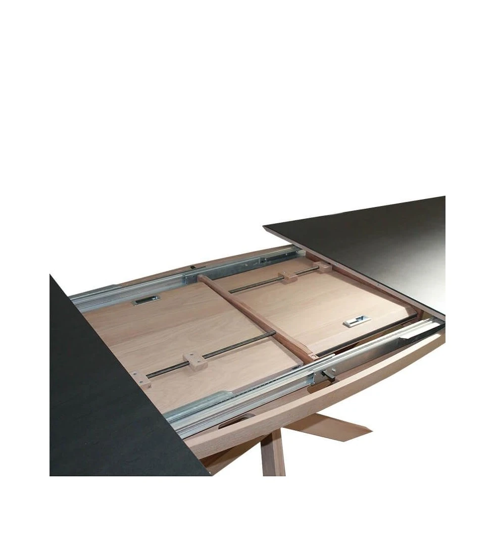 Système d’allonge(s) : ouverture centrale synchronisée avec allonges rangées en portefeuille ou hors de la table