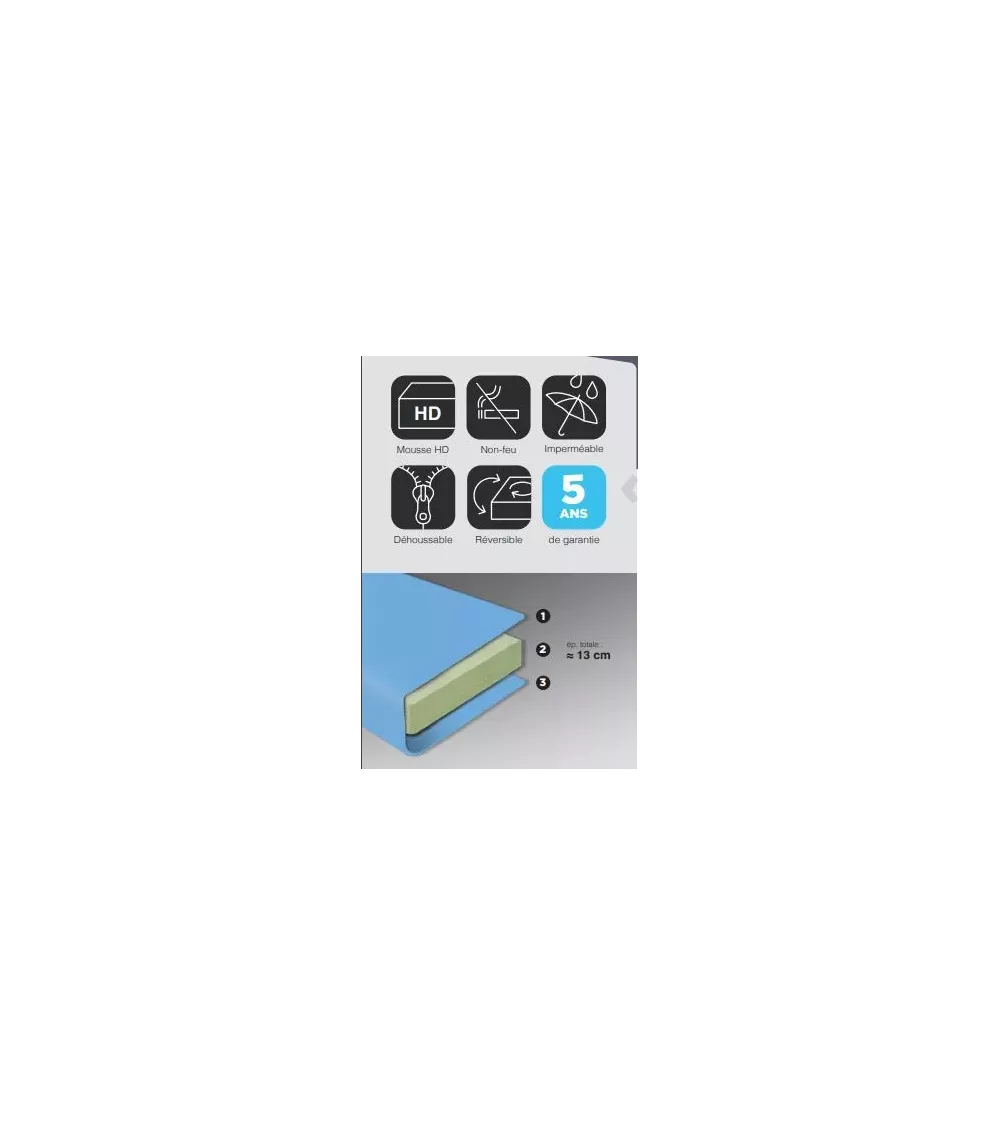 – Housse non piquée 100% Polyester certifié CRIB 5 (Non feu équivalence M1)