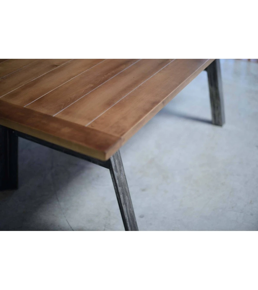 Une table de repas industrielle tendance. La table STATION est fabriquée en piétement métal robuste 8 cm de section en fer cornière. Elle est disponible en plusieurs finition métal brossé ou en métal laqué noir anthracite autre coloris sur demande. Le dessus en bois massif de hêtre est constitué de plusieurs lames reliées par le bout.